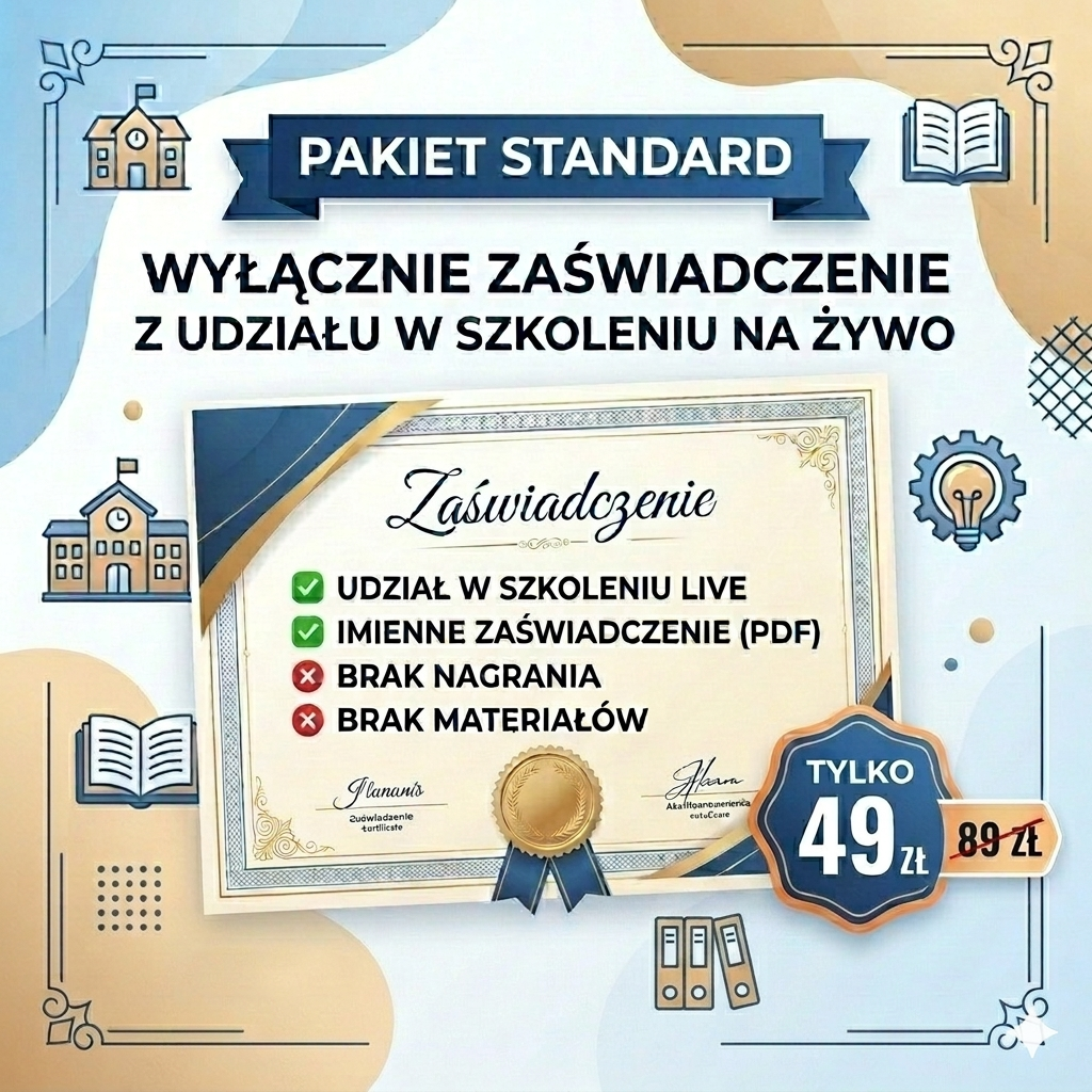 - zaświadczenie w formacie PDF do pobrania i samodzielnego wydruku z udziału w szkoleniu na żywo